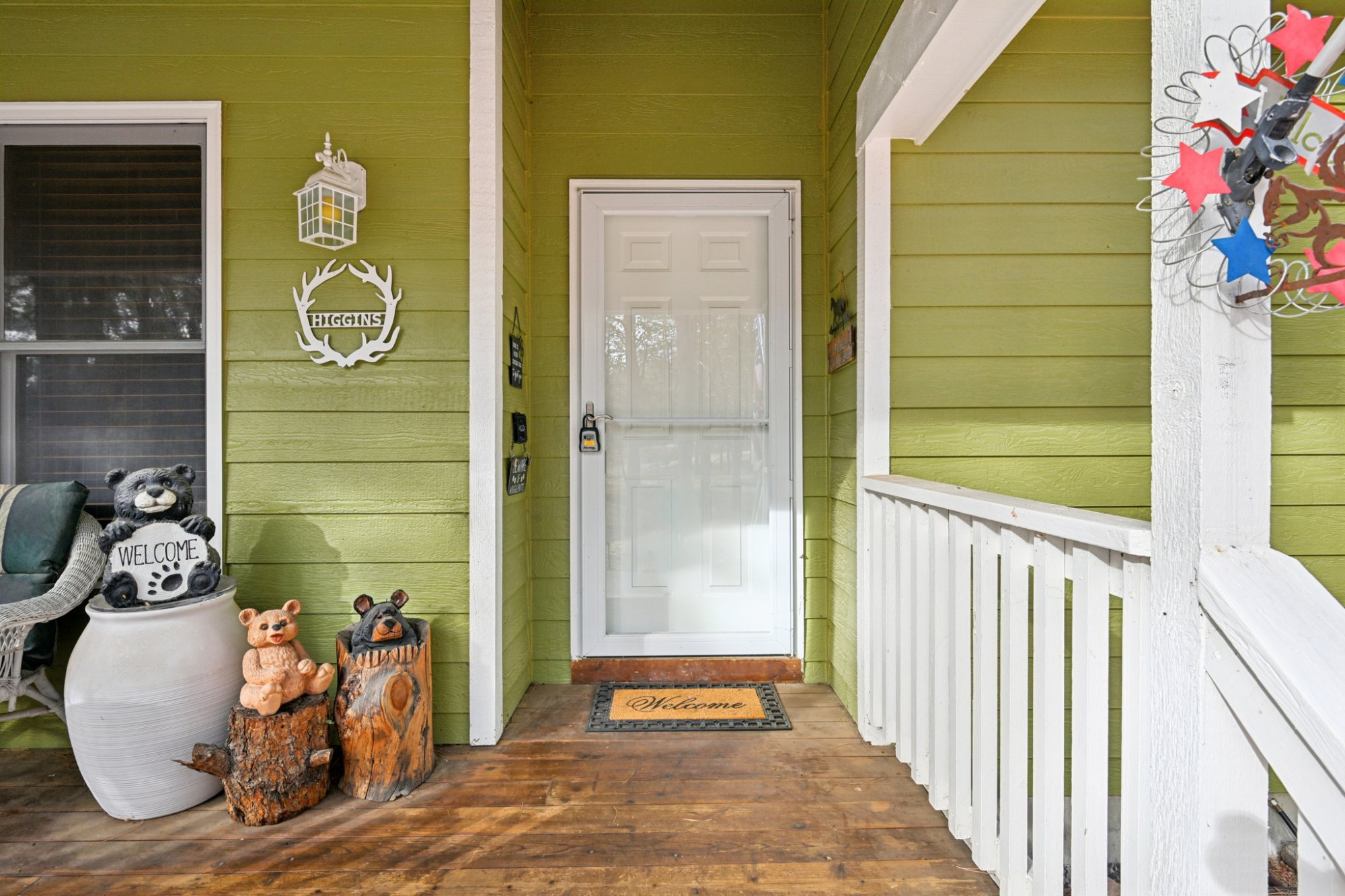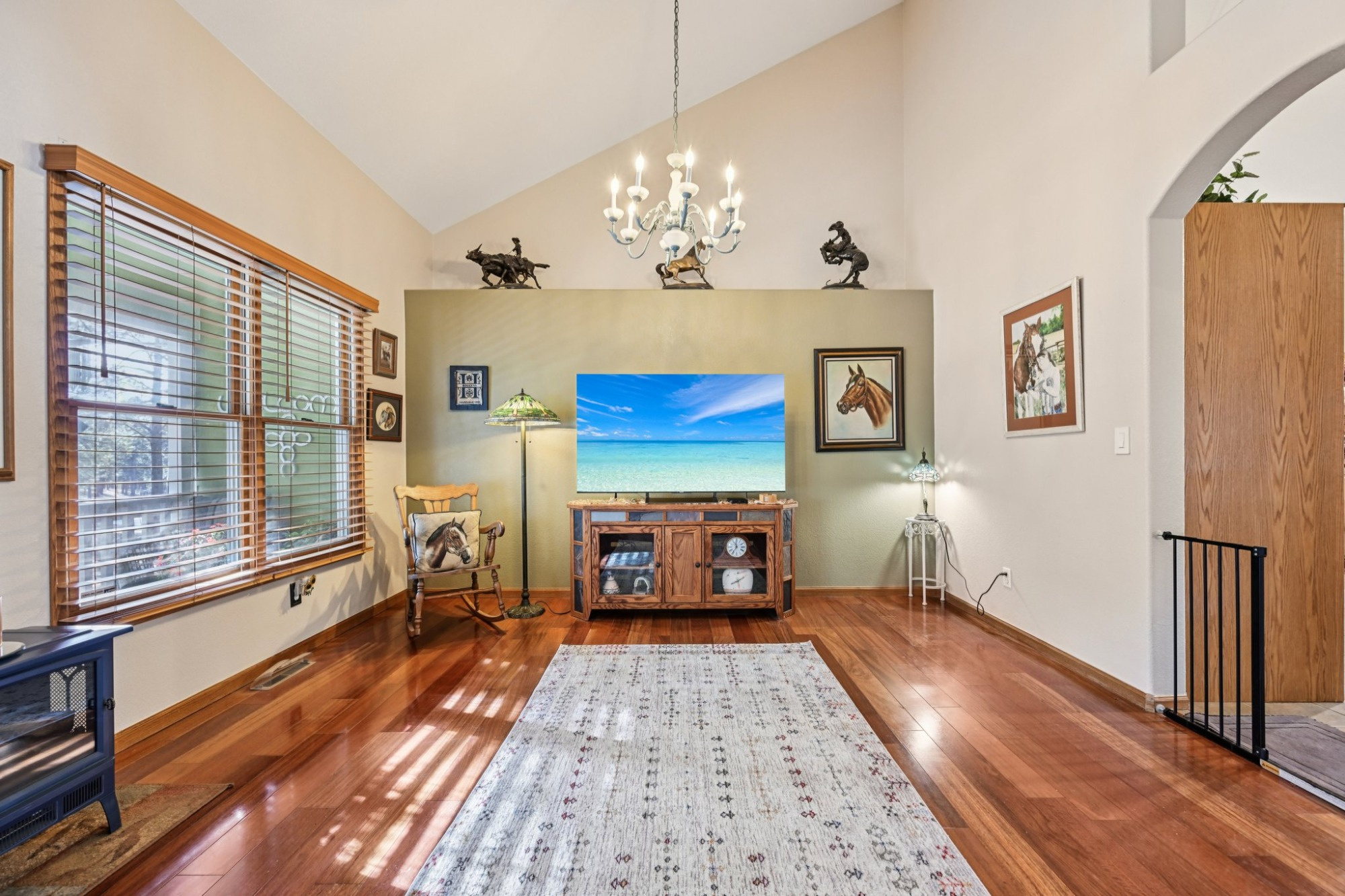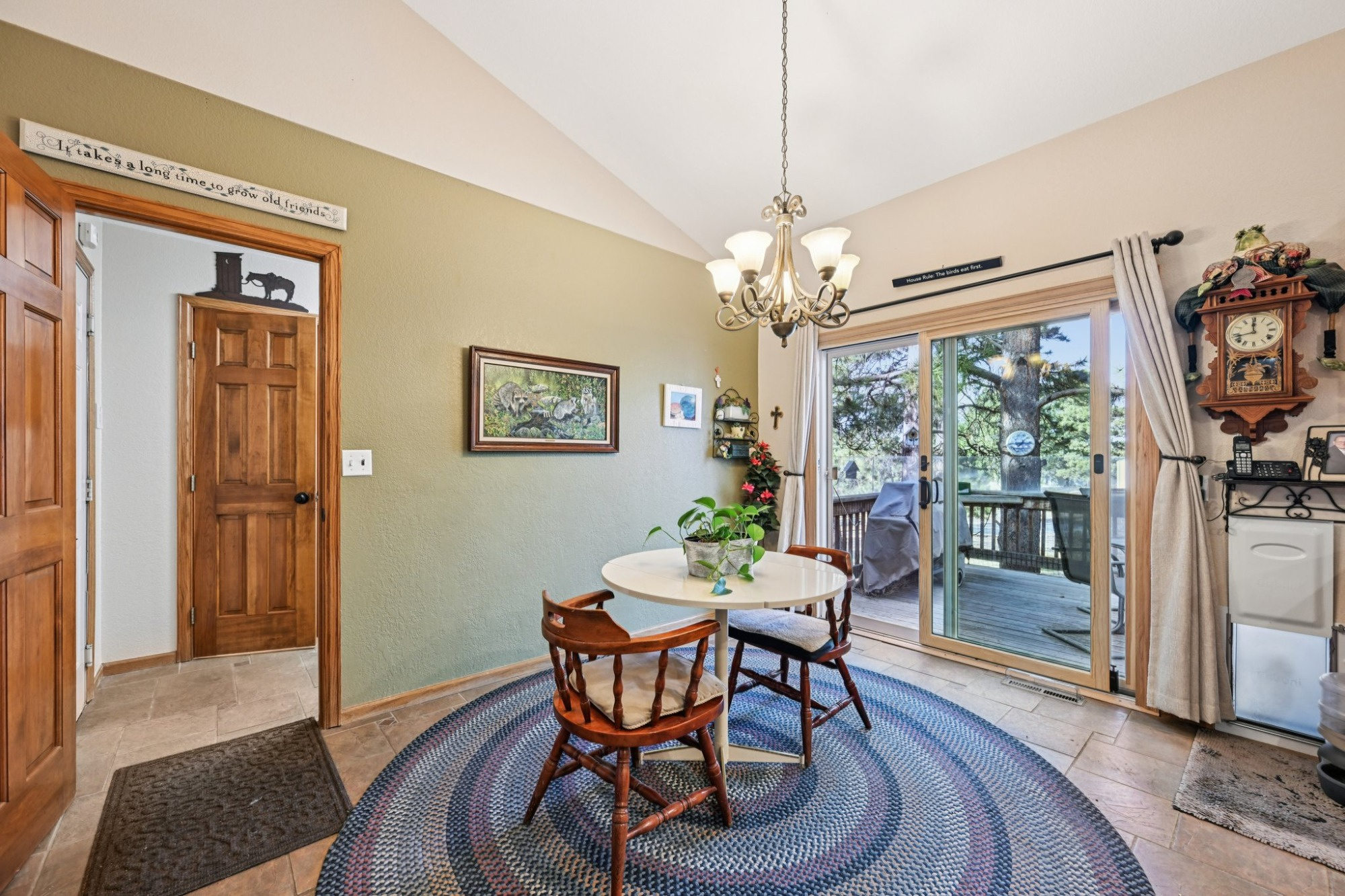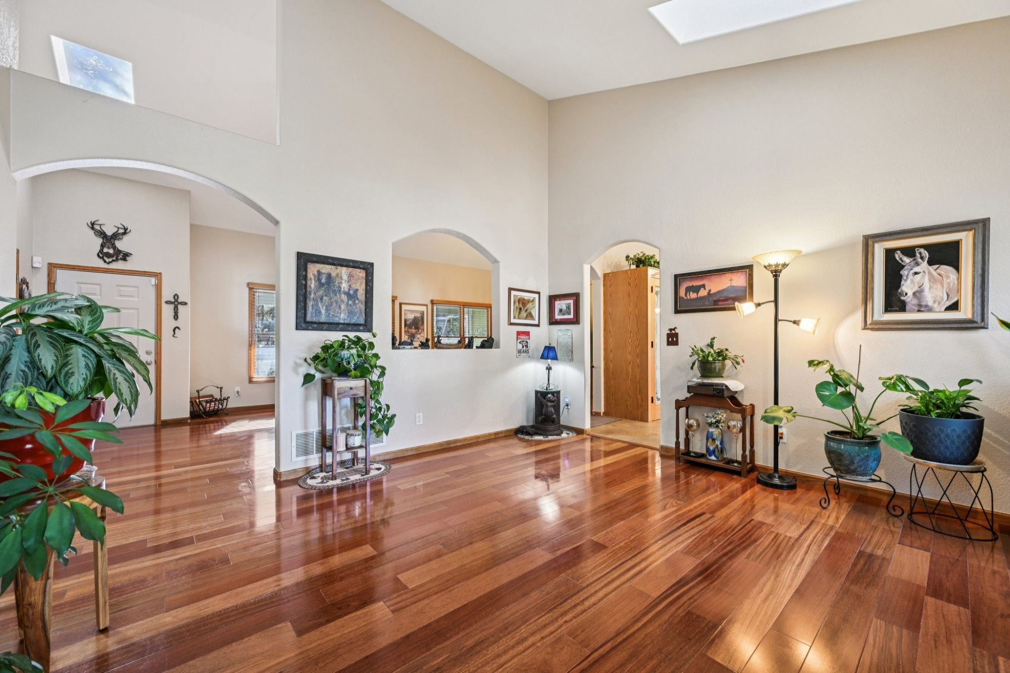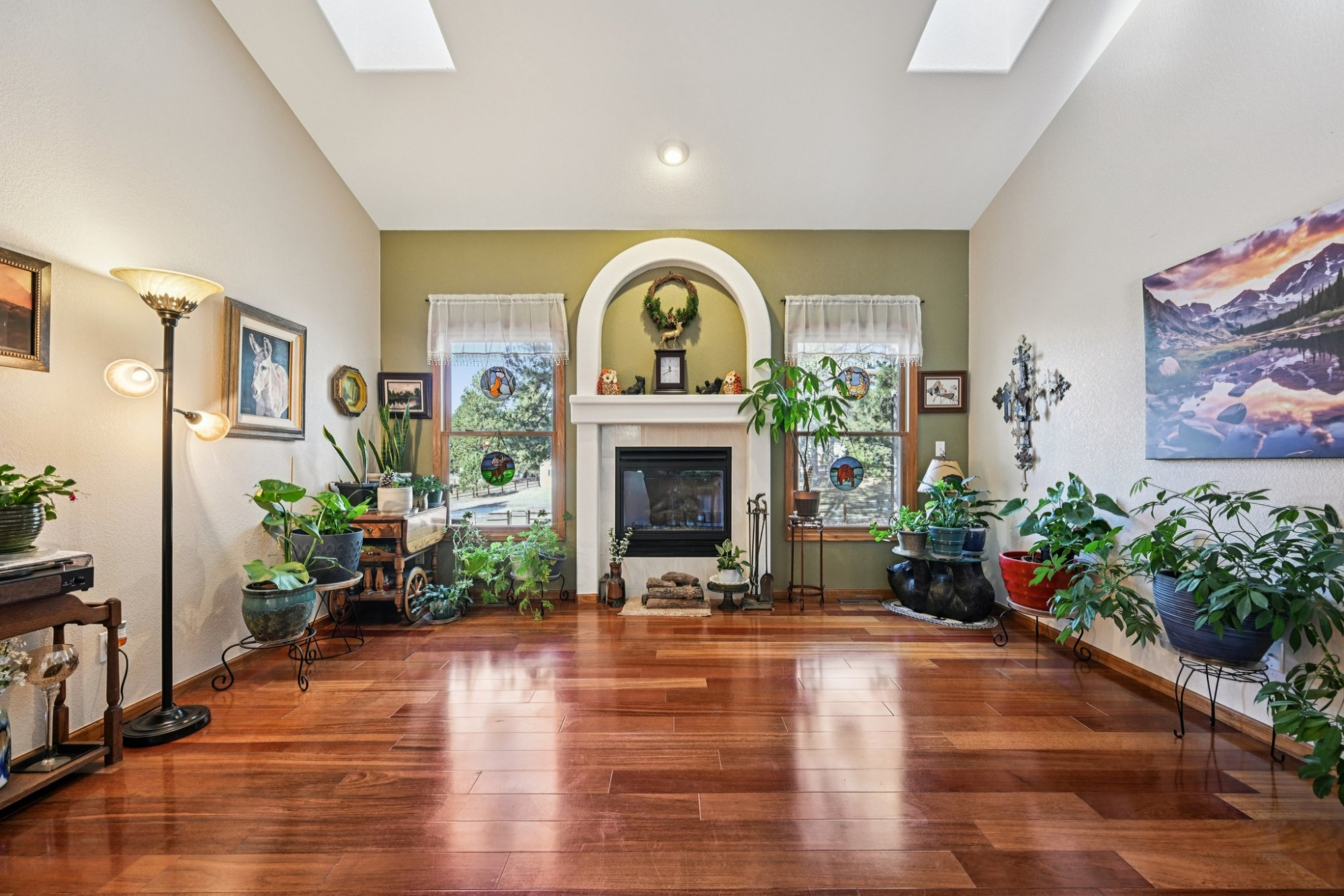 The welcoming covered front porch that looks out onto the forested property, invites you inside to a light filled main level floorplan with vaulted ceilings that flows effortlessly between living, dining, and kitchen spaces. The bright living/dining room has large Anderson windows, skylights and hardwood flooring that continues into the family room.