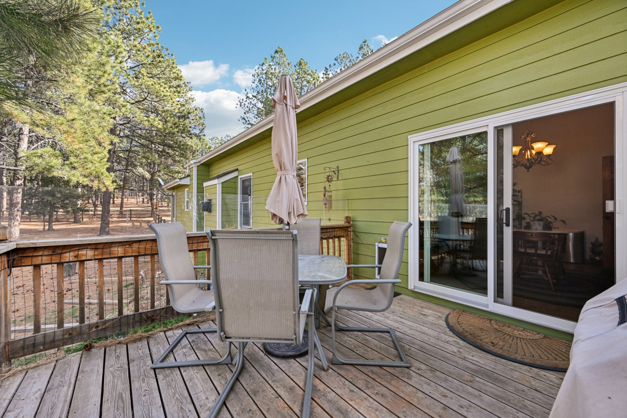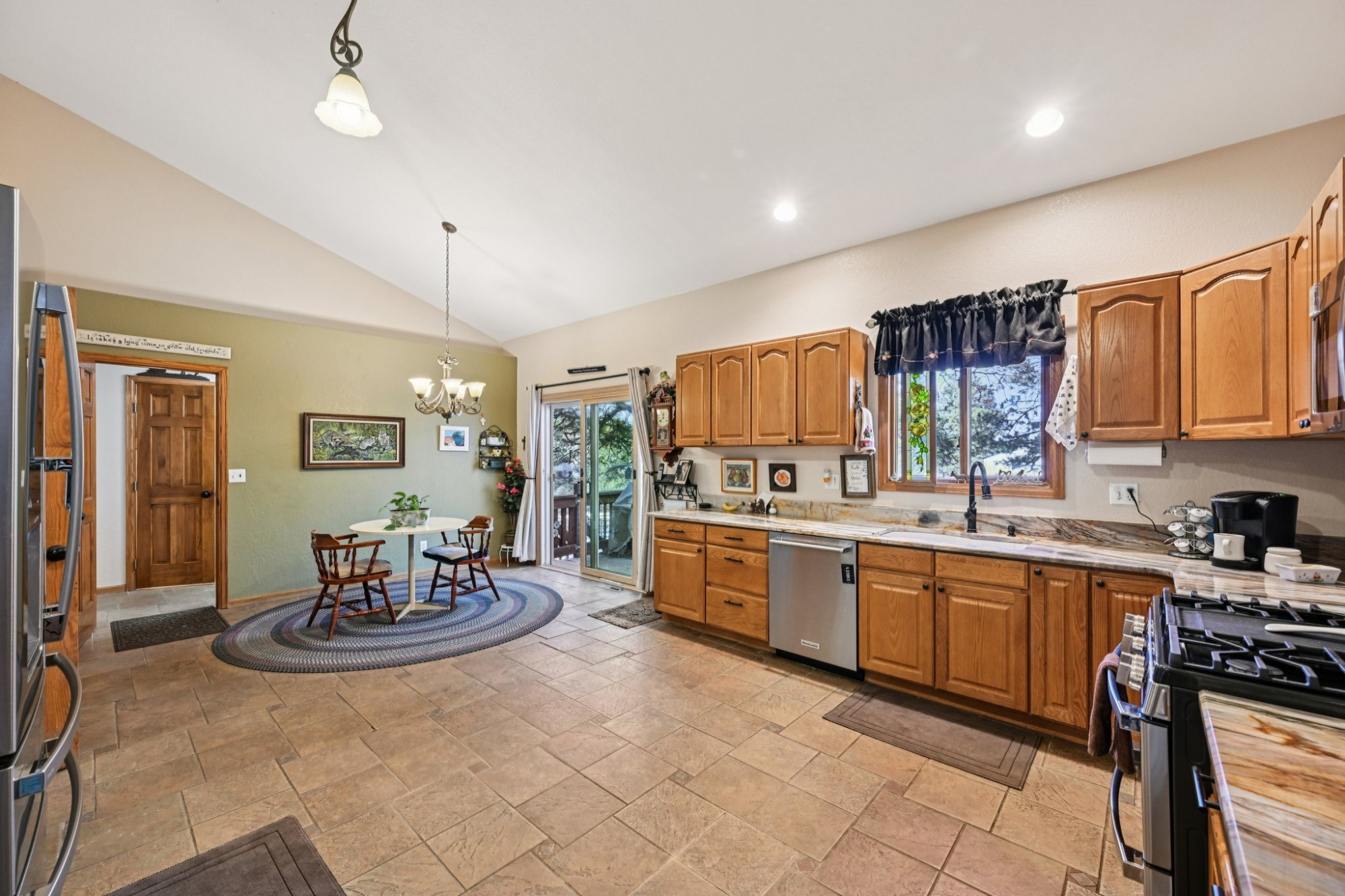 The spacious family room is graced by a cozy gas fireplace and peaceful views of the surrounding acreage. The large kitchen features solid granite countertops, stainless steel appliances including a gas cooktop and plenty of storage in the cabinetry and pantry. The breakfast nook has a glass slider that leads out to the back deck, perfect for entertaining or relaxing in a peaceful, private setting while enjoying the mature ponderosas.